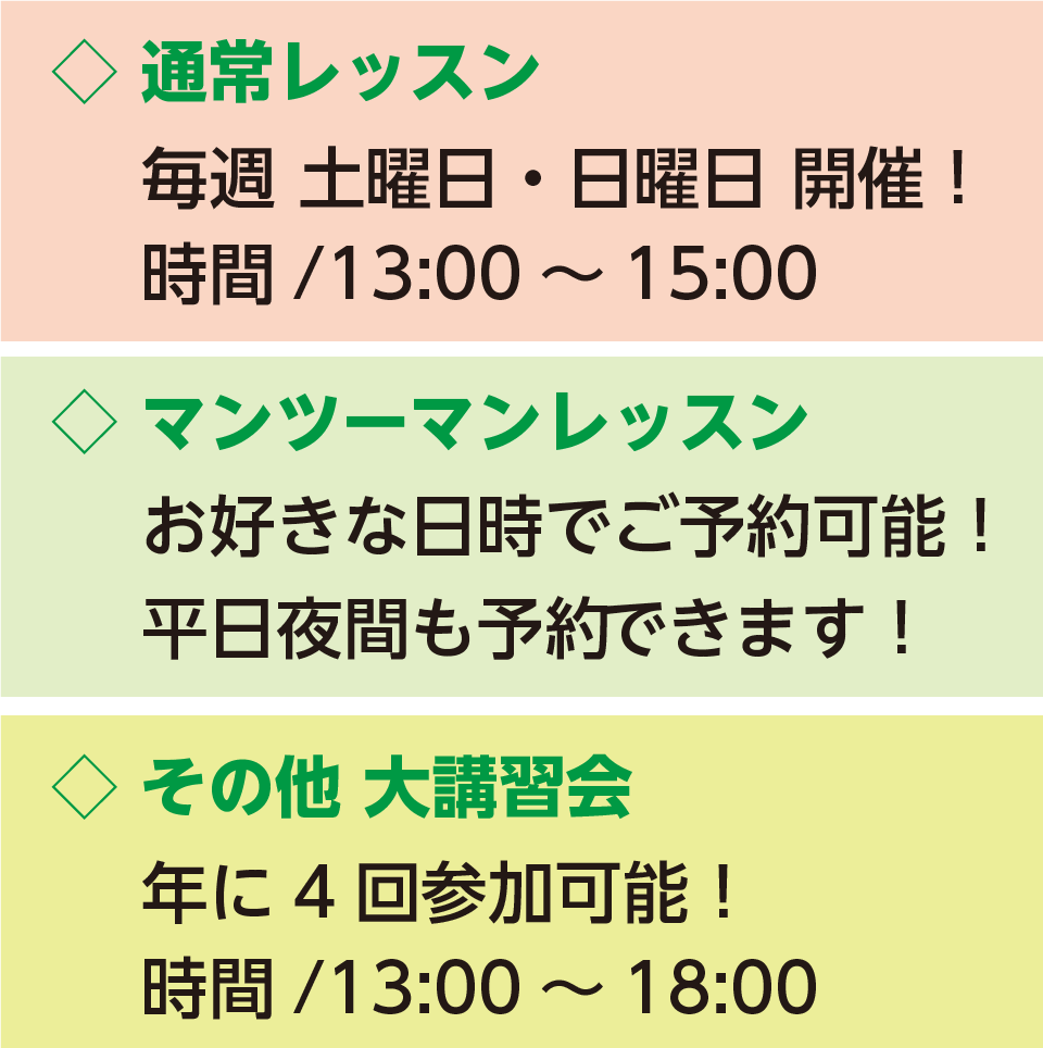 A.通常のカリキュラムでは月1回のグループレッスンと月1回のマンツーマンレッスンを受けていきます。その他オプションメニューがありますので、目的に合わせてカリキュラムと組み合わせることができます。