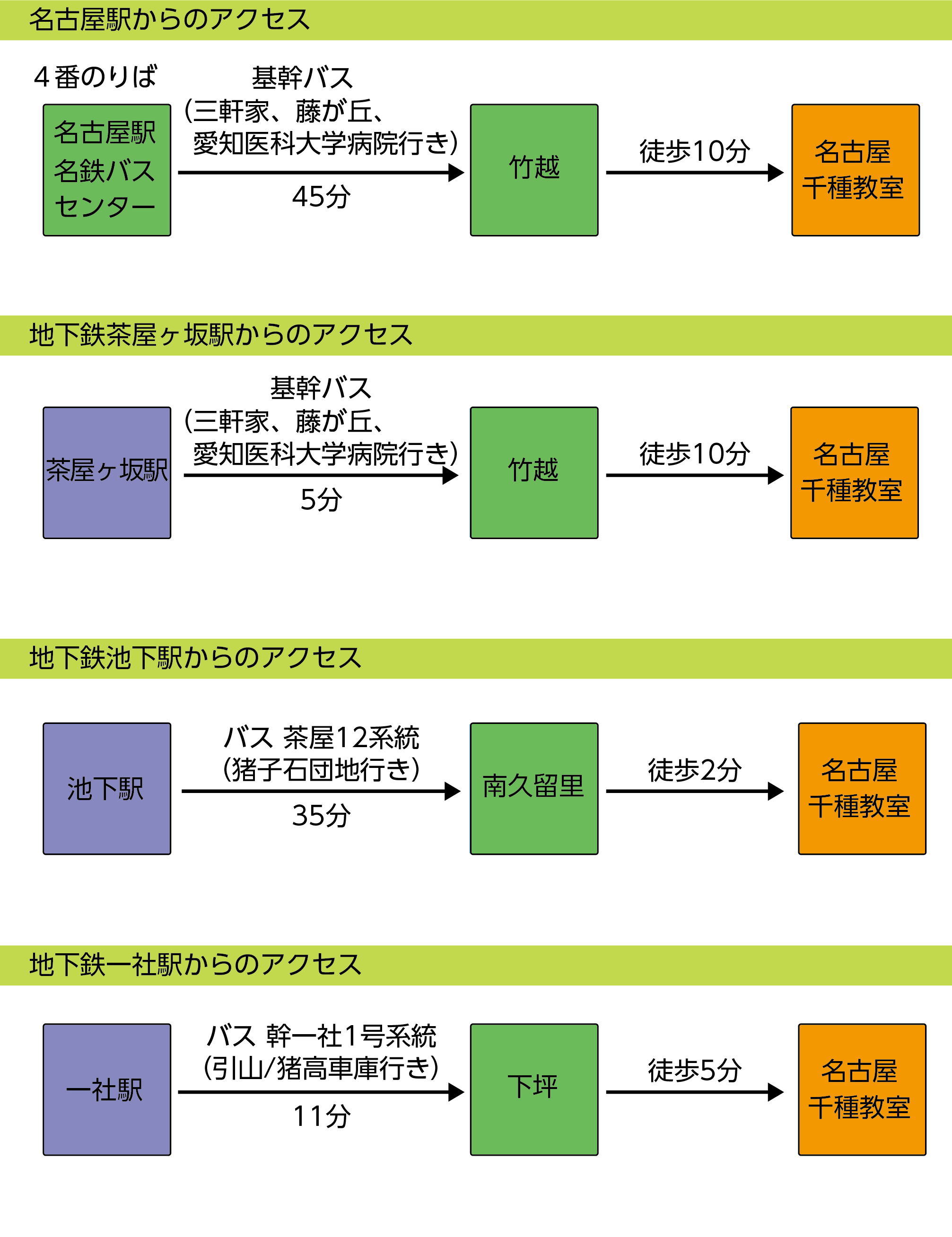 岐阜各務原本校は岐阜駅から車で28分、電車で25分~35分。名古屋校は名古屋駅から車で30分、電車バス乗り継ぎで45分~50分。岐阜本校では岐阜各務原・岐阜市・関市・可児市・美濃加茂市・大垣市・一宮市などの地域の方。名古屋校は名古屋・一宮・春日井・小牧・豊田・三重・静岡などの地域の皆様。岐阜本校は各務原イオンから車で約10分。名古屋校は近くにアスティがあります。岐阜校・名古屋校共に通学に便利。名古屋で話し方を学ぶならアトリエシャンティ。