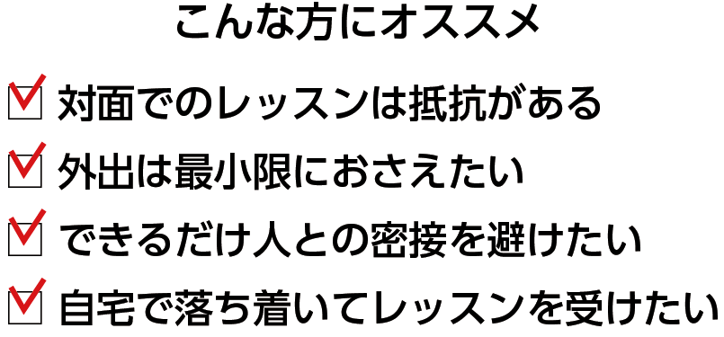 通常のレッスンは対面でのマンツーマン指導ですが、外出が難しい場合や設定されたレッスンの日時でスケジュールがとりにくい場合など、自宅でのマンツーマン指導が受けられます。不特定多数の人が使用する場所に抵抗があるといった方には電話指導は向いています。