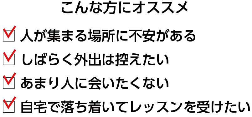通常のレッスンは対面でのマンツーマン指導ですが、外出が難しい場合や設定されたレッスンの日時でスケジュールがとりにくい場合など、自宅でのマンツーマン指導が受けられます。不特定多数の人が使用する場所に抵抗があるといった方にも電話指導は向いています。